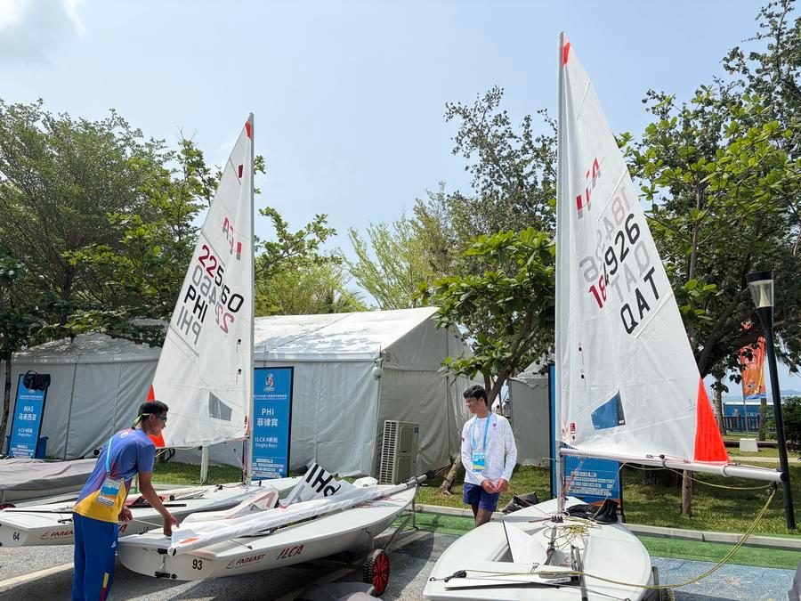 SANYA, April 28 (Xinhua) -- After adjusting their sails, brothers Thani and Tameem Shams pushed their boats into the water and waved to the volunteers on shore.