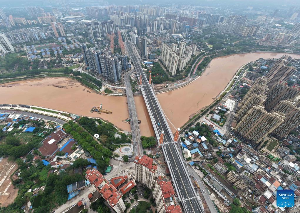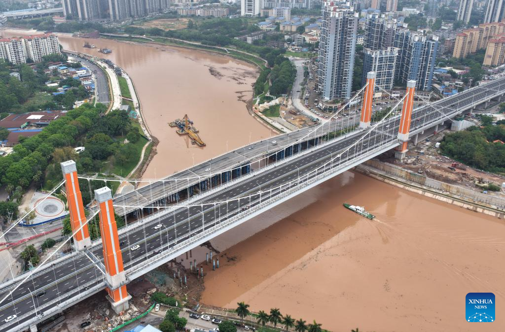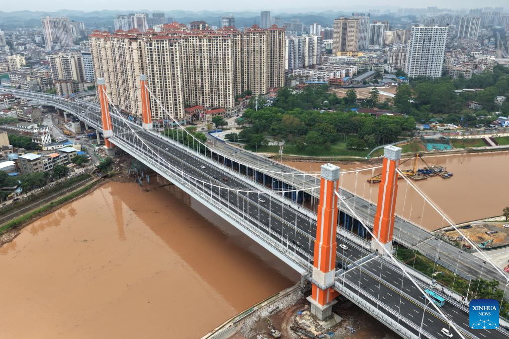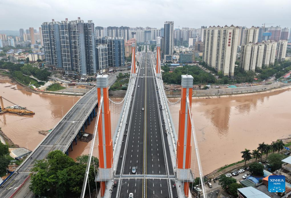 An aerial drone photo taken on April 28, 2026 shows the Zicai bridge of Pinglu Canal in Qinzhou, south China's Guangxi Zhuang Autonomous Region. The Zicai bridge, a key project across the Pinglu Canal, officially opened to traffic on Tuesday. It is the newest of all 27 planned bridges spanning the Pinglu Canal. (Xinhua/Zhou Hua)