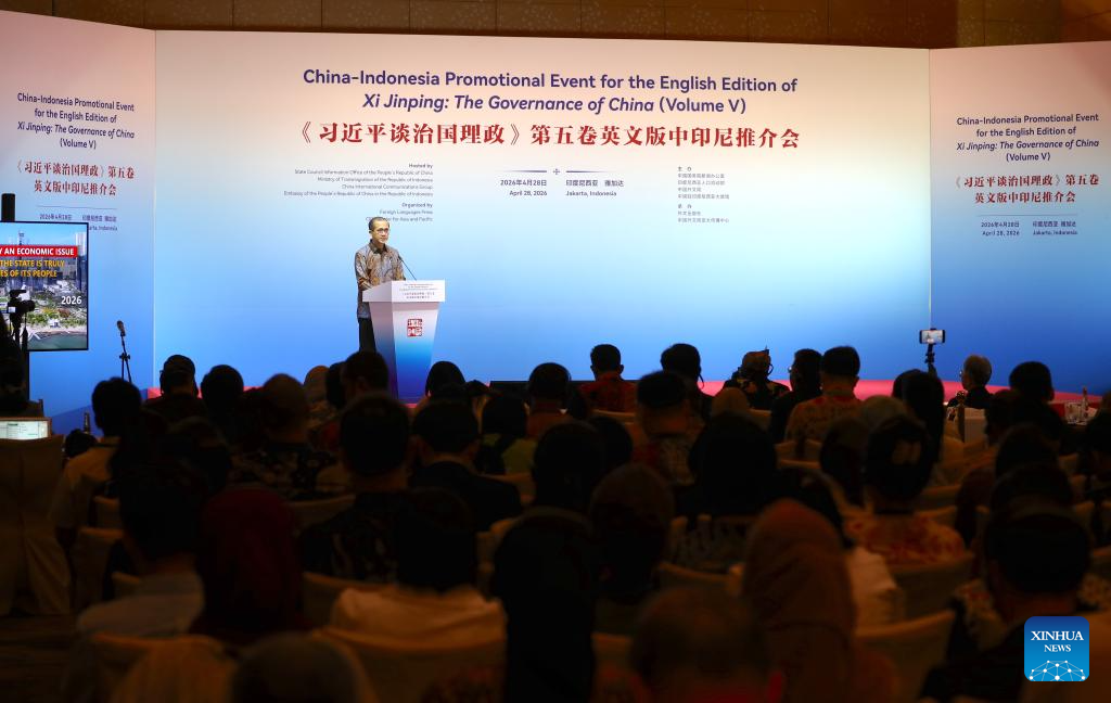 Copies of the English edition of the fifth volume of "Xi Jinping: The Governance of China" are presented to Indonesian guests at a promotional event in Jakarta, Indonesia, April 28, 2026. A promotional event for the English edition of the fifth volume of "Xi Jinping: The Governance of China" was held in Jakarta on Tuesday. (Xinhua/Cen Yunpeng)