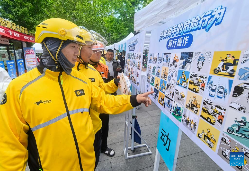 Deliverymen participate in a traffic knowledge contest in Chaoyang District, Beijing, capital of China, April 28, 2026. A volunteer activity was held here on Tuesday to offer free medicine consultations, haircuts and knowledge contests for young people in new employment sectors. (Xinhua/Li Xin)