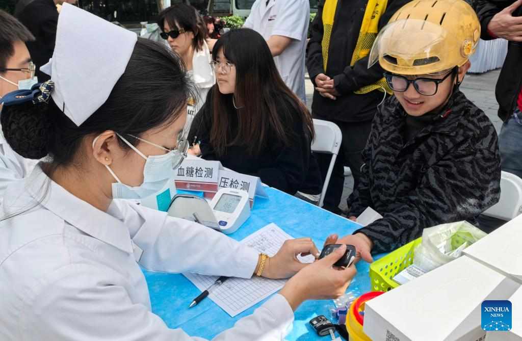 A volunteer tests blood sugar level for a deliveryman in Chaoyang District, Beijing, capital of China, April 28, 2026. A volunteer activity was held here on Tuesday to offer free medicine consultations, haircuts and knowledge contests for young people in new employment sectors. (Xinhua/Li Xin)