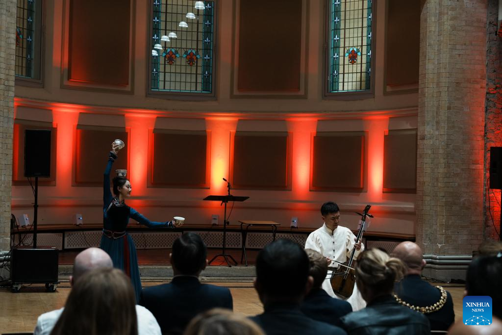 This photo taken on April 27, 2026 shows a performance by students from South-Central Minzu University based in Wuhan, central China's Hubei Province, in Manchester, Britain. Performers from South-Central Minzu University captivated audiences at Halle St Peter's in Manchester on Monday night with Chinese folk songs and dances, kicking off an eight-month program marking the 40th anniversary of the sister-city partnership with Wuhan. (Xinhua/Zhao Jiasong)