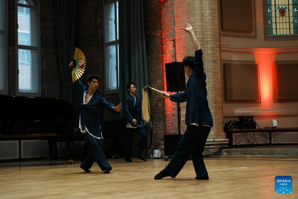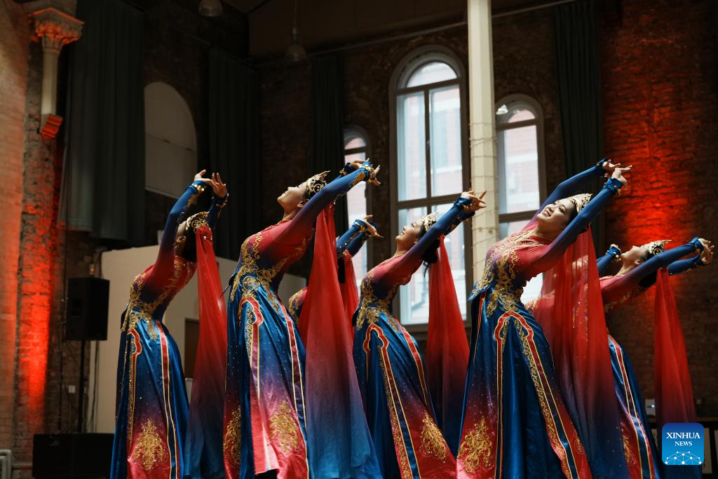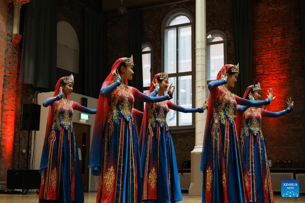 This photo taken on April 27, 2026 shows a performance by students from South-Central Minzu University based in Wuhan, central China's Hubei Province, in Manchester, Britain.