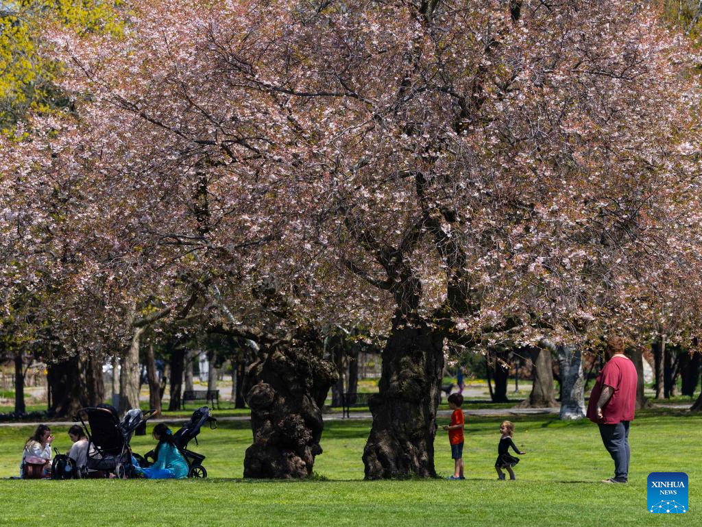 People spend leisure time under blooming cherry trees in a park in Hamilton, Ontario, Canada, on April 27, 2026. Cherry blossoms across Ontario have reached full bloom recently as temperatures rise, attracting numerous visitors. (Photo by Zou Zheng/Xinhua)