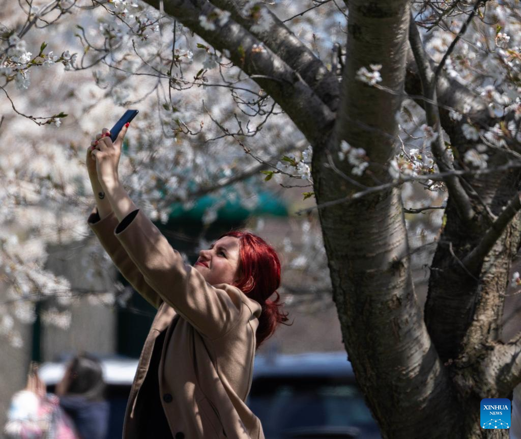 A woman takes photos of cherry blossoms in a park in Hamilton, Ontario, Canada, on April 27, 2026. Cherry blossoms across Ontario have reached full bloom recently as temperatures rise, attracting numerous visitors. (Photo by Zou Zheng/Xinhua)