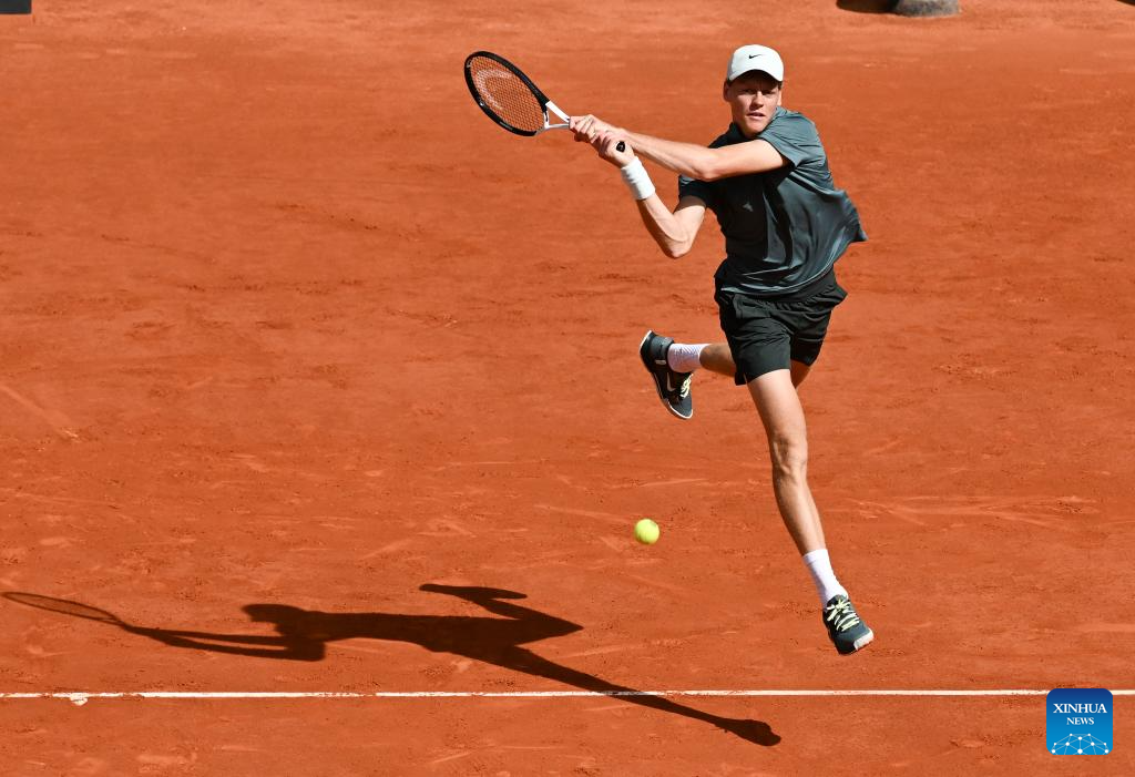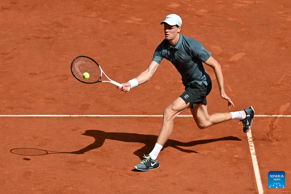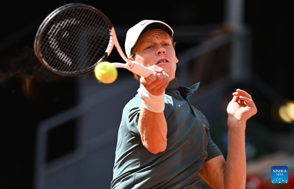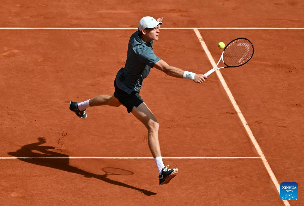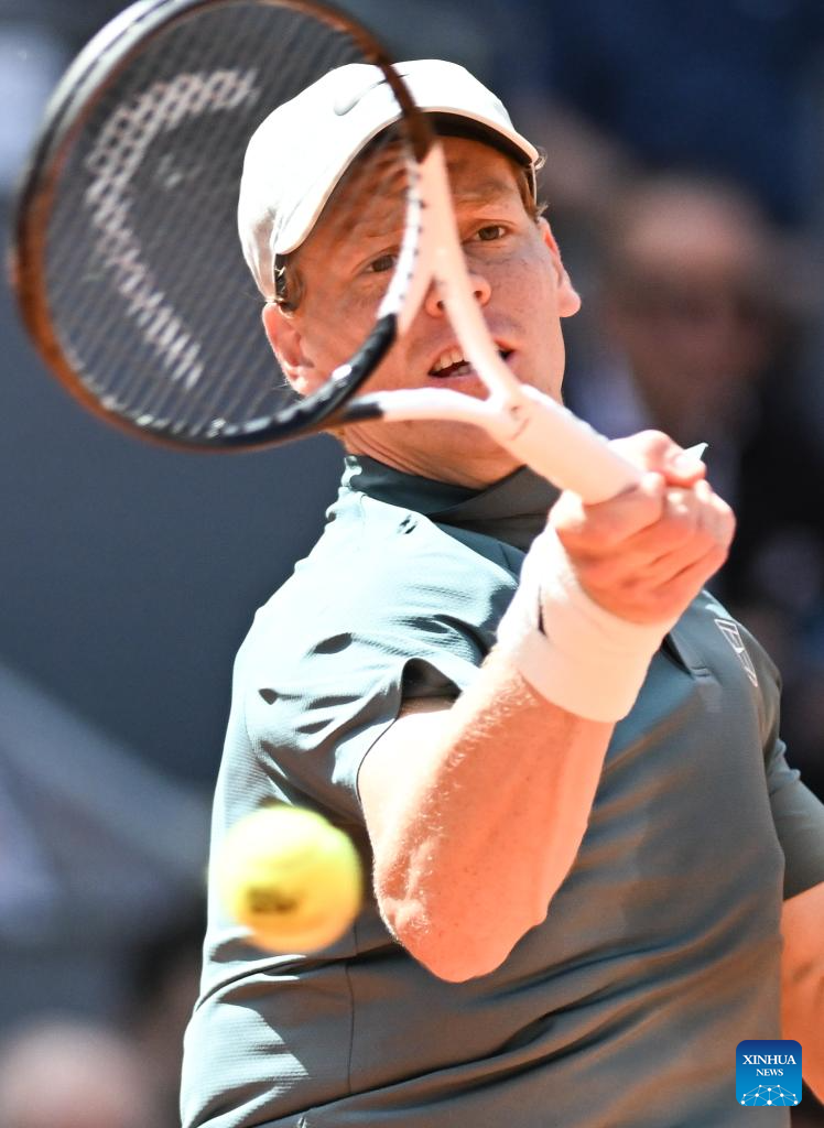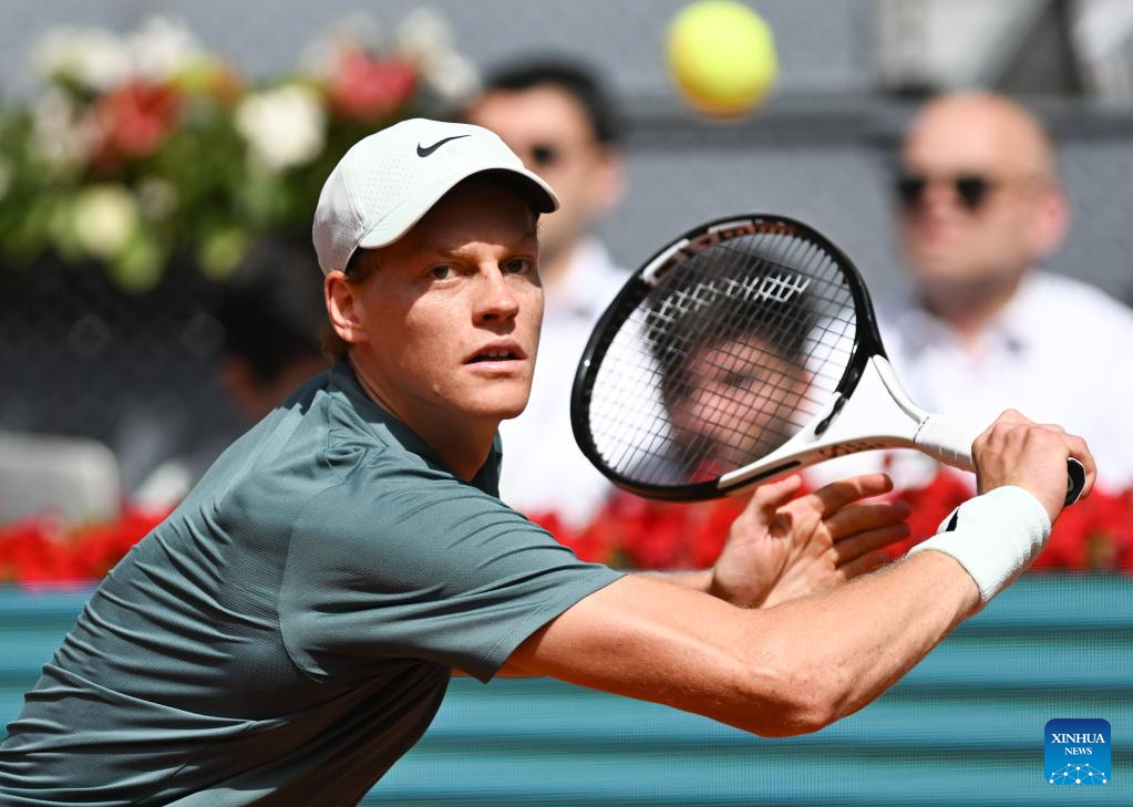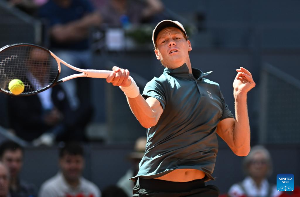 Jannik Sinner hits a return during the men's singles round of 16 match between Jannik Sinner of Italy and Cameron Norrie of Britain at the 2026 Madrid Open tennis tournament in Madrid, Spain, on April 28, 2026. (Xinhua/Cheng Min)