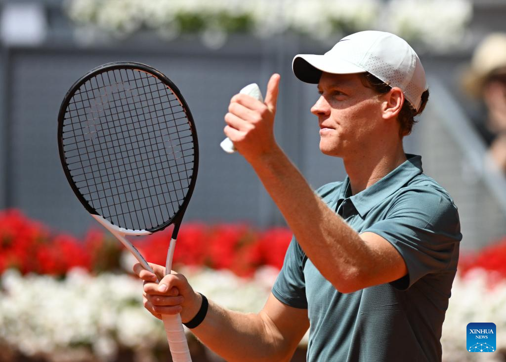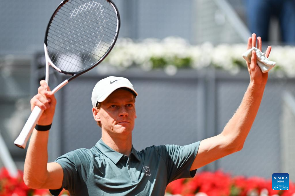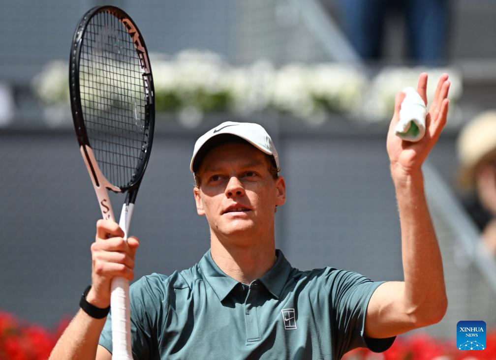 Jannik Sinner greets the spectators after the men's singles round of 16 match between Jannik Sinner of Italy and Cameron Norrie of Britain at the 2026 Madrid Open tennis tournament in Madrid, Spain, on April 28, 2026. (Xinhua/Cheng Min)