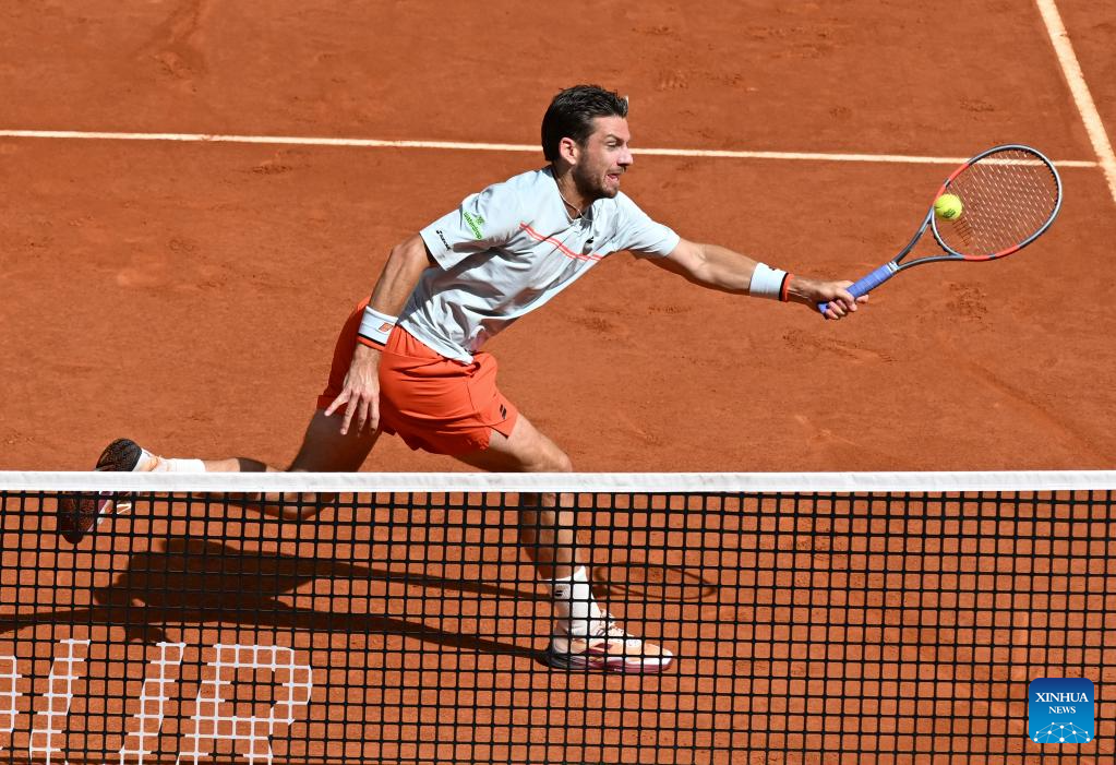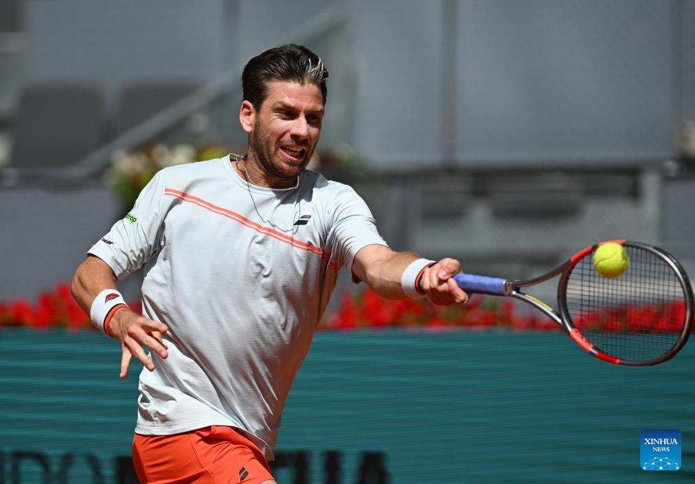 Cameron Norrie hits a return during the men's singles round of 16 match between Jannik Sinner of Italy and Cameron Norrie of Britain at the 2026 Madrid Open tennis tournament in Madrid, Spain, on April 28, 2026. (Xinhua/Cheng Min)