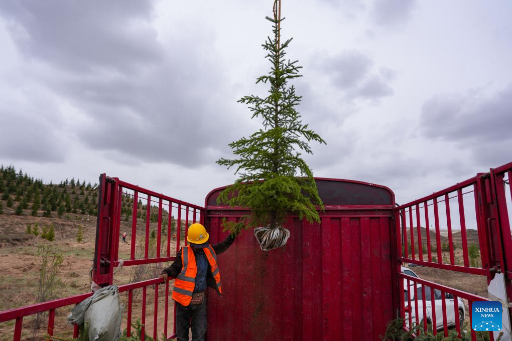 A drone lifts a sapling from a truck at a park in Lanzhou, northwest China's Gansu Province, April 27, 2026. Over the past few days, several drones shuttle back and forth over more than 2,300 mu (about 153 hectares) of barren hills here to accurately lift saplings and efficiently assist afforestation operations.