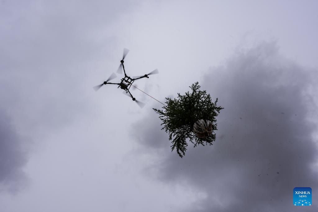 The local natural resources and planning bureau said that compared with the traditional manual operation, the drones were more suitable for the complex terrain, safer and more time-saving for transporting saplings. (Xinhua/Lang Bingbing)