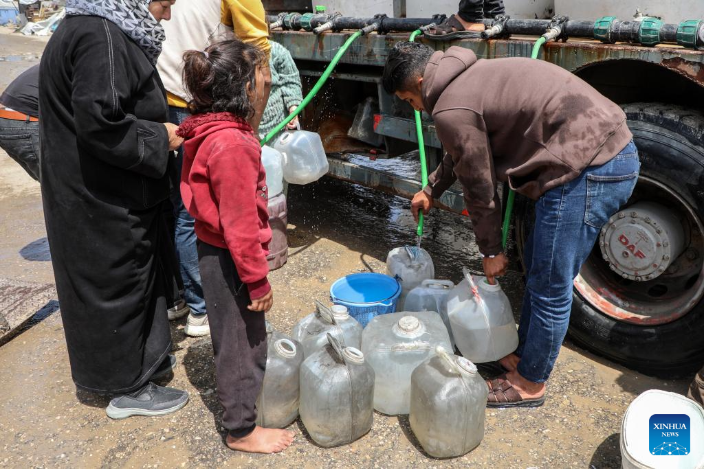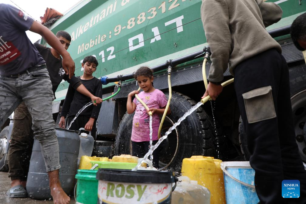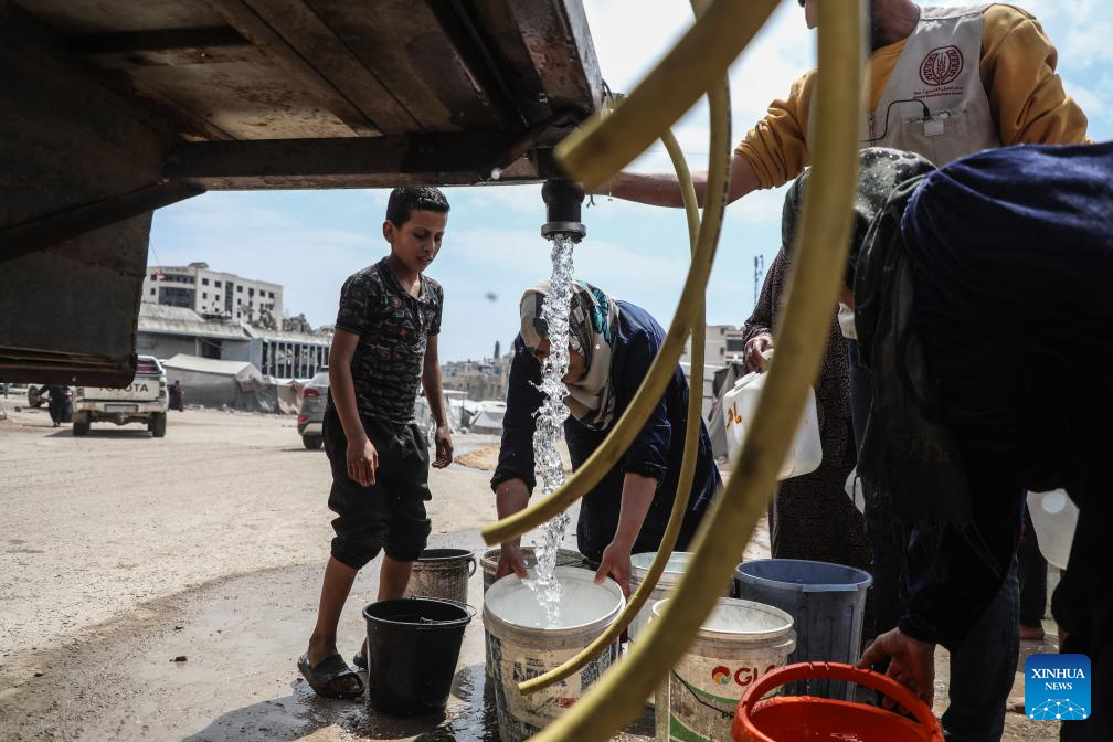 Palestinians fetch water in Gaza City, April 27, 2026. According to the UNICEF, across Gaza, the average daily supply is only 7 litres of drinking water, but many people do not have access to even the minimum 6 litres a day of clean drinking water. (Photo by Rizek Abdeljawad/Xinhua)