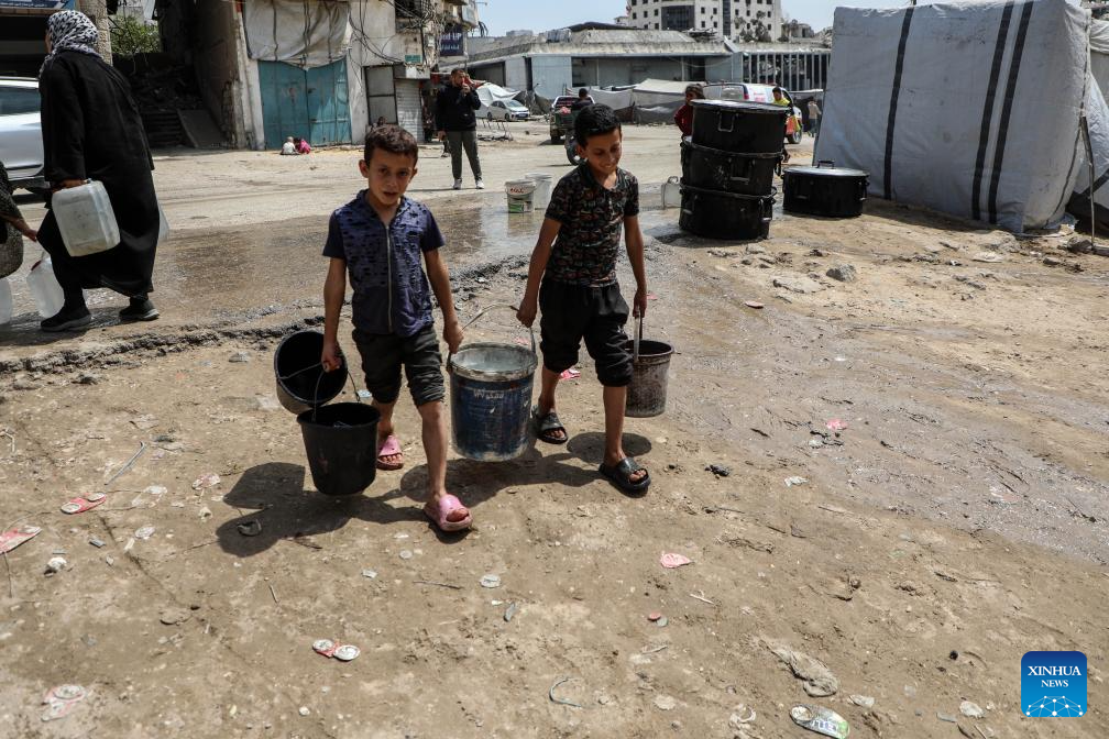 Palestinian boys fetch water in Gaza City, April 27, 2026. According to the UNICEF, across Gaza, the average daily supply is only 7 litres of drinking water, but many people do not have access to even the minimum 6 litres a day of clean drinking water. (Photo by Rizek Abdeljawad/Xinhua)