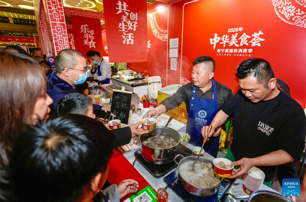 Consumers buy beef balls from south China's Guangdong Province during a Chinese cuisine carnival in Yinchuan, northwest China's Ningxia Hui Autonomous Region, on April 28, 2026. (Xinhua/Yang Zhisen)