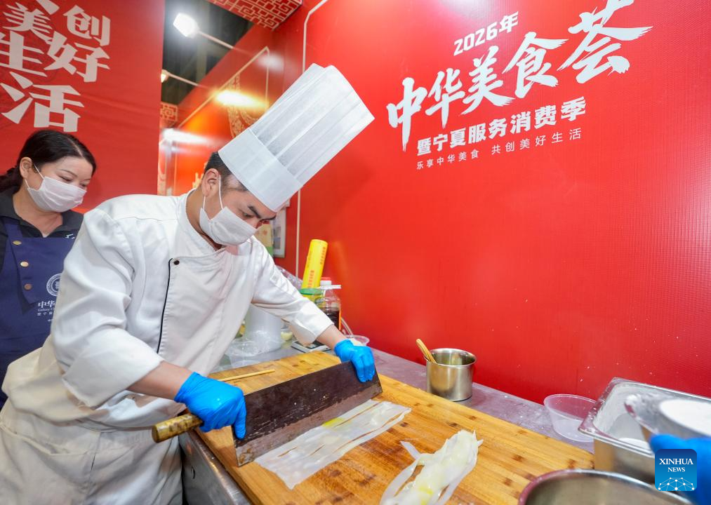 An exhibitor makes food originated from northwest China's Shaanxi Province during a Chinese cuisine carnival in Yinchuan, northwest China's Ningxia Hui Autonomous Region, on April 28, 2026. (Xinhua/Yang Zhisen)