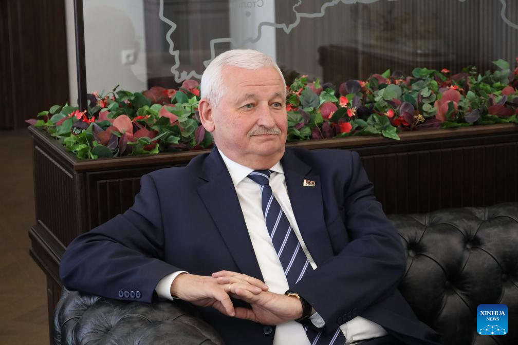 Chairman of the Brest Regional Executive Committee of Belarus, Petr Parkhomchik, receives an interview with Xinhua in Brest, Belarus, April 28, 2026. (Brest Regional Executive Committee of Belarus/Handout via Xinhua)
