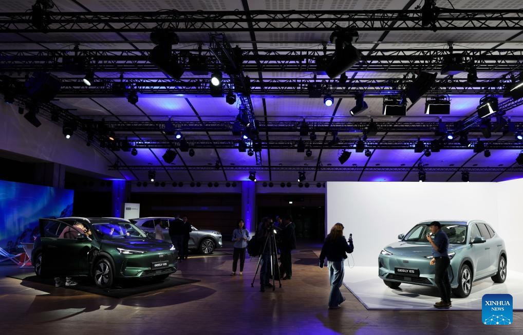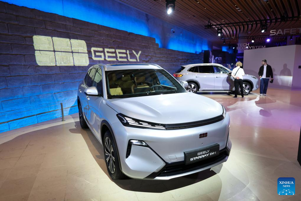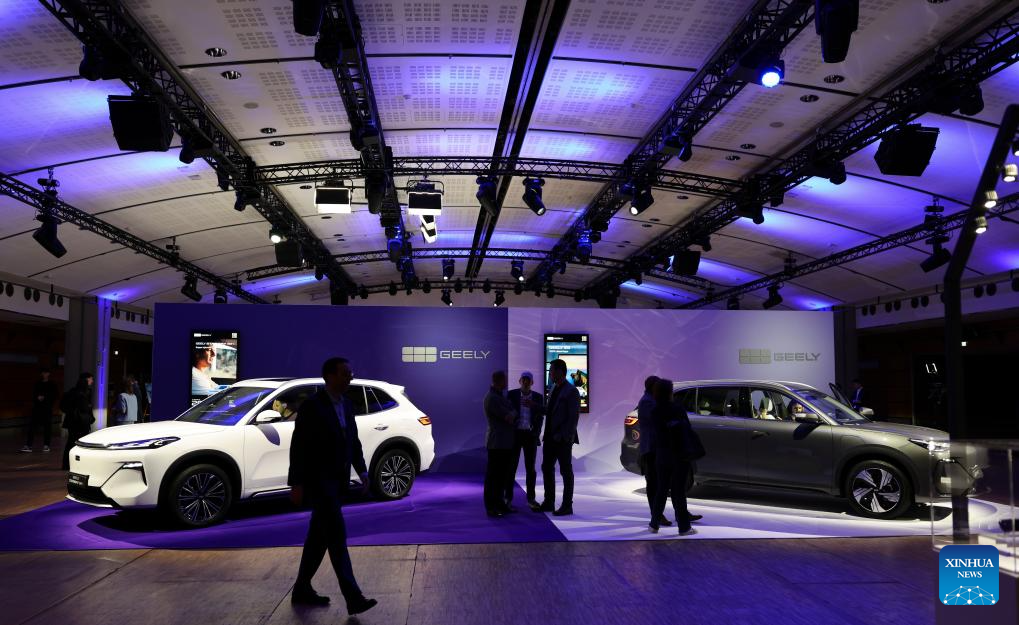 People view Geely vehicles in Paris, France on April 28, 2026. Geely Auto officially launched two electric SUVs, the Starray EM-i and the Geely E5, at an event in Paris, France on Tuesday. (Xinhua/Wu Huiwo)