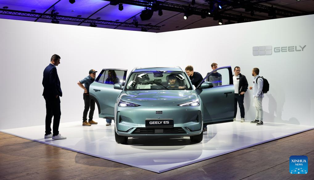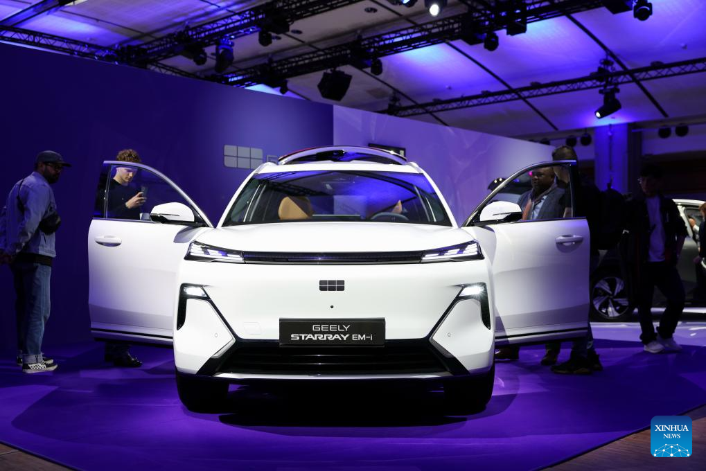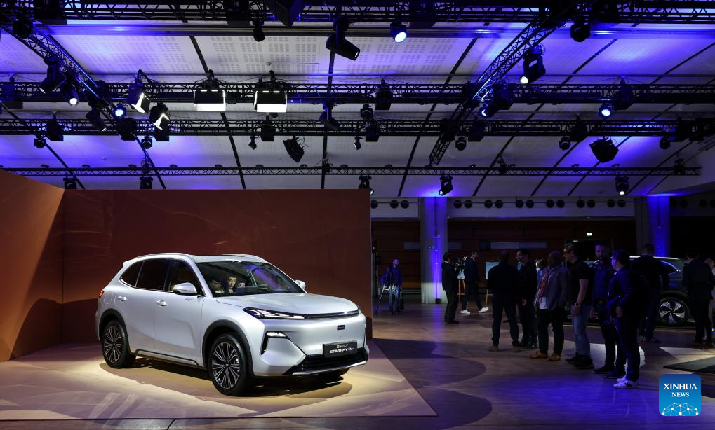 People view a Geely vehicle in Paris, France on April 28, 2026. Geely Auto officially launched two electric SUVs, the Starray EM-i and the Geely E5, at an event in Paris, France on Tuesday. (Xinhua/Wu Huiwo)