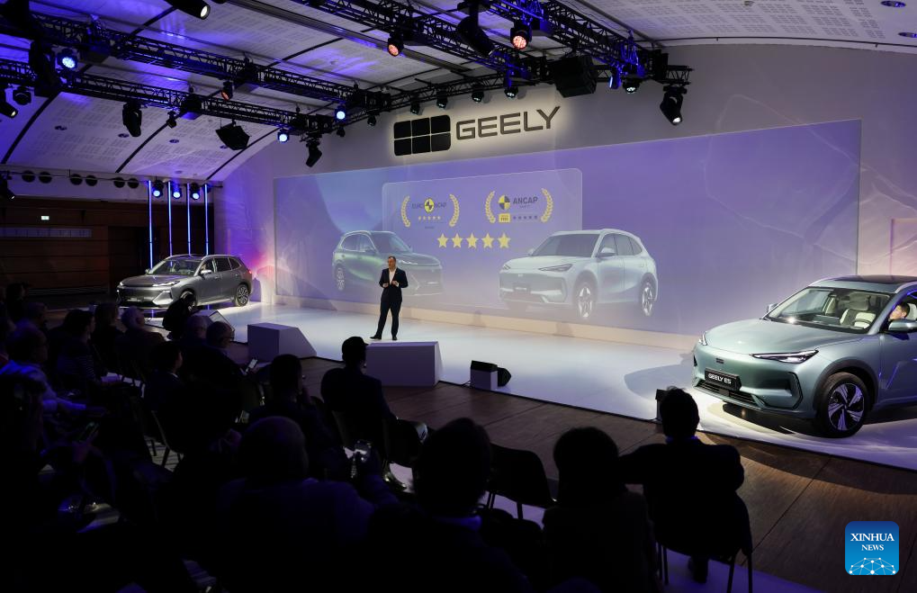 Two Geely SUVs are launched during an event in Paris, France on April 28, 2026. Geely Auto officially launched two electric SUVs, the Starray EM-i and the Geely E5, at an event in Paris, France on Tuesday. (Xinhua/Wu Huiwo)