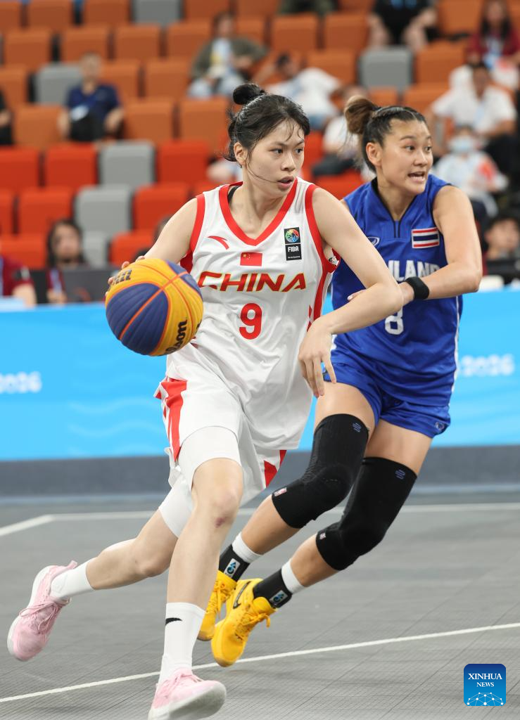 Wang Lili (R) of China shoots during the 3x3 basketball women's semifinal between China and Thailand at the 6th Asian Beach Games in Sanya, south China's Hainan Province, April 29, 2026. (Photo by Ma Zihan/Xinhua)