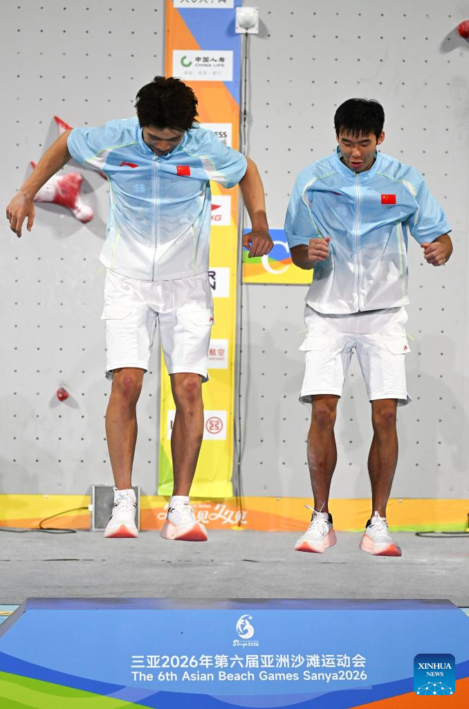 Gold medalists Zhao Yicheng (L)/Long Jianguo of China react during the awarding ceremony for the men's relay of sport climbing (speed) at the 6th Asian Beach Games in Sanya, south China's Hainan Province, April 29, 2026. (Xinhua/Wei Hai)