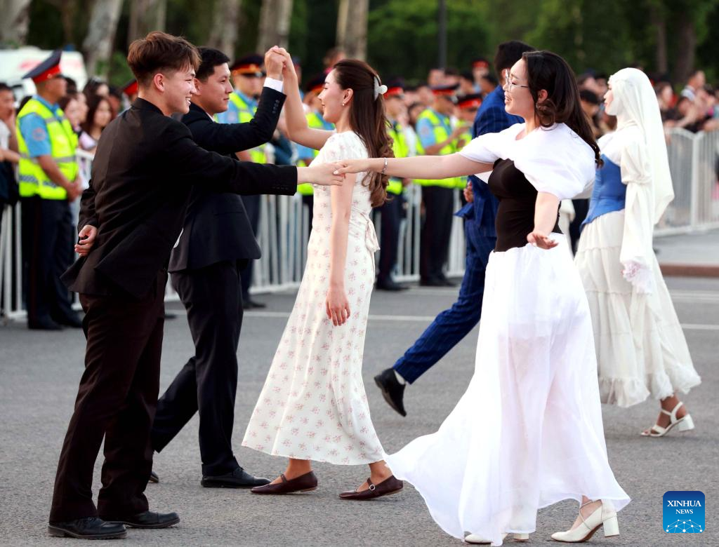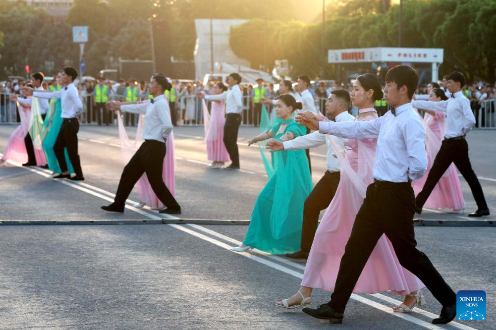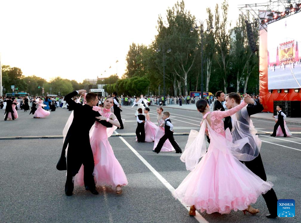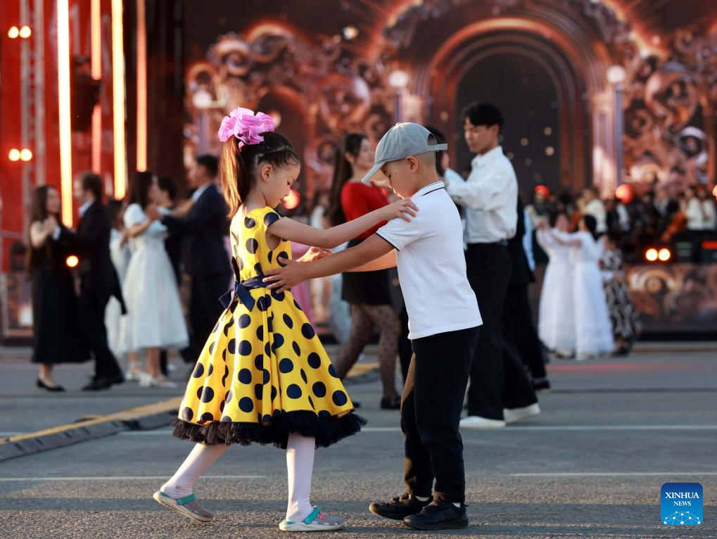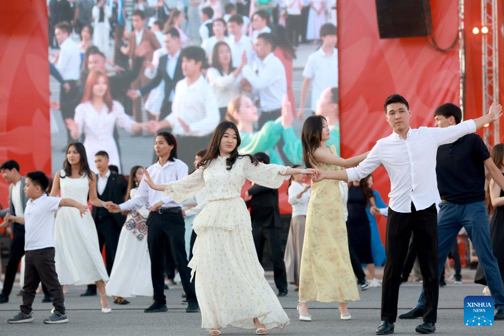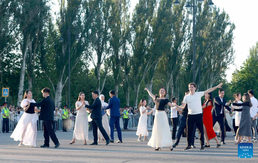 Citizens perform at the dance festival "Waltz Night" in Bishkek, Kyrgyzstan, April 29, 2026. A dance festival titled "Waltz Night" was held on Wednesday in Bishkek. The event, marking the 148th anniversary of the city, featured nearly a thousand professional artists and citizens. (Photo by Roman/Xinhua)