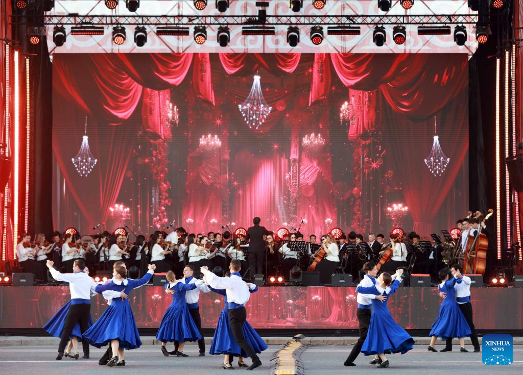 Artists perform at the dance festival "Waltz Night" in Bishkek, Kyrgyzstan, April 29, 2026. A dance festival titled "Waltz Night" was held on Wednesday in Bishkek. The event, marking the 148th anniversary of the city, featured nearly a thousand professional artists and citizens. (Photo by Roman/Xinhua)