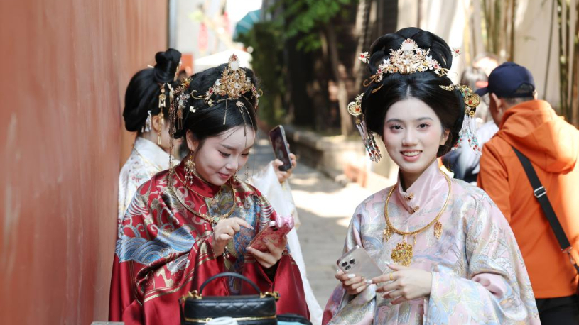 People enlighten historic blocks with traditional costumes in Fuzhou during Spring Festival holiday