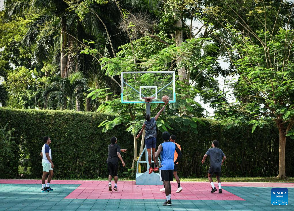 People play basketball at Malabo National Park in Malabo, the capital of Equatorial Guinea, May 19, 2024. Constructed by the China Road and Bridge Corporation (CRBC), Malabo National Park, one of the largest city parks in Central Africa, was officially put into operation in 2016. The construction of the park has brought numerous job opportunities for local people and enriched the cultural life of Equatorial Guinea. (Xinhua/Han Xu)