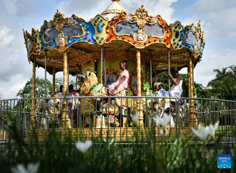 Visitors ride a carousel at Malabo National Park in Malabo, the capital of Equatorial Guinea, May 19, 2024. Constructed by the China Road and Bridge Corporation (CRBC), Malabo National Park, one of the largest city parks in Central Africa, was officially put into operation in 2016. The construction of the park has brought numerous job opportunities for local people and enriched the cultural life of Equatorial Guinea. (Xinhua/Han Xu)