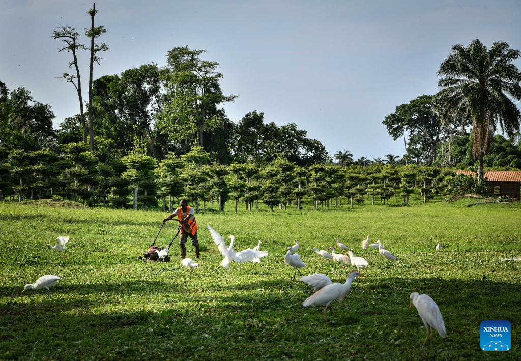 A gardener operates a lawn mower in Malabo National Park in Malabo, the capital of Equatorial Guinea, May 18, 2024. Constructed by the China Road and Bridge Corporation (CRBC), Malabo National Park, one of the largest city parks in Central Africa, was officially put into operation in 2016. The construction of the park has brought numerous job opportunities for local people and enriched the cultural life of Equatorial Guinea. (Xinhua/Han Xu)