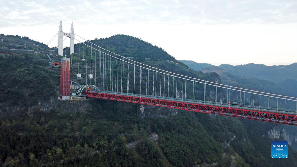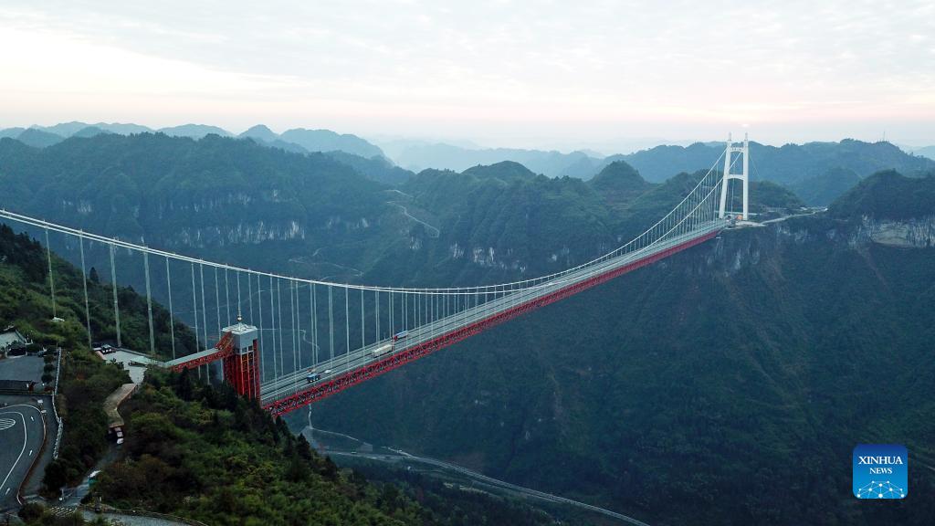 Aerial photo taken on Dec. 2, 2021 shows the Aizhai suspension bridge in Xiangxi Tujia and Miao Autonomous Prefecture, central China's Hunan Province. (Xinhua/Chen Zhenhai)