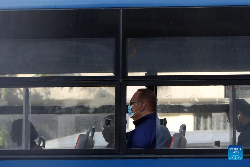 A man wearing a mask is seen on a bus in Cairo, Egypt, Dec. 18, 2021. Egypt confirmed its first three cases of COVID-19 Omicron variant, the Health Ministry announced late on Friday. Two of the cases are not showing any symptoms, while the third suffers mild symptoms, the ministry said in a statement. (Xinhua/Ahmed Gomaa)