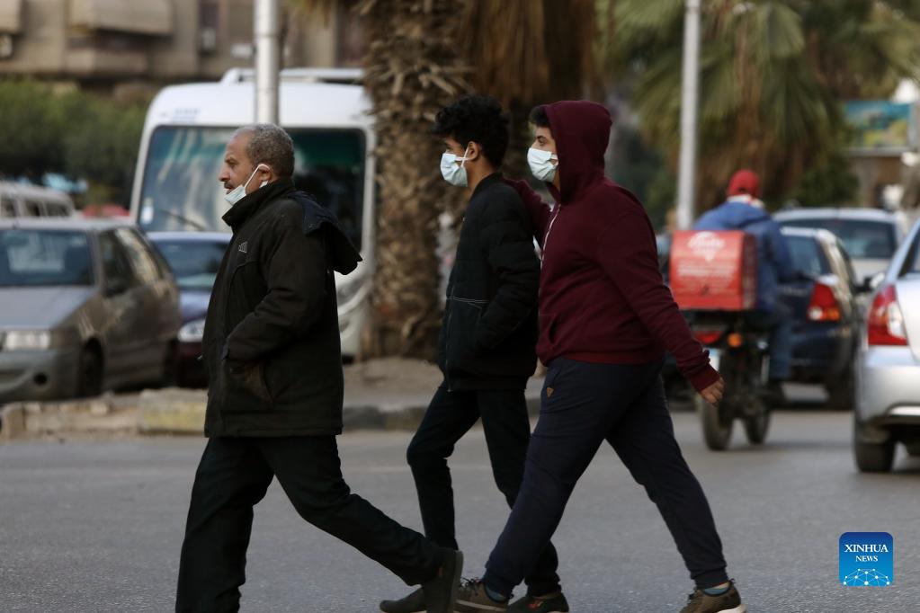 People wearing masks walk on a street in Cairo, Egypt, Dec. 18, 2021. Egypt confirmed its first three cases of COVID-19 Omicron variant, the Health Ministry announced late on Friday. Two of the cases are not showing any symptoms, while the third suffers mild symptoms, the ministry said in a statement. (Xinhua/Ahmed Gomaa)
