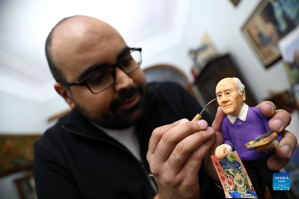 Egyptian artist Fady Francis works on the miniature statue of Spanish painter Pablo Picasso at his workshop in Cairo, Egypt, on Jan. 2, 2022. On a table in downtown Cairo, Fady Francis, 30, aligns miniature sculptures of 100 influential world figures, standing side by side in harmony, although the figures were from different cultures, spoke different languages and lived in different eras in history. (Xinhua/Ahmed Gomaa)