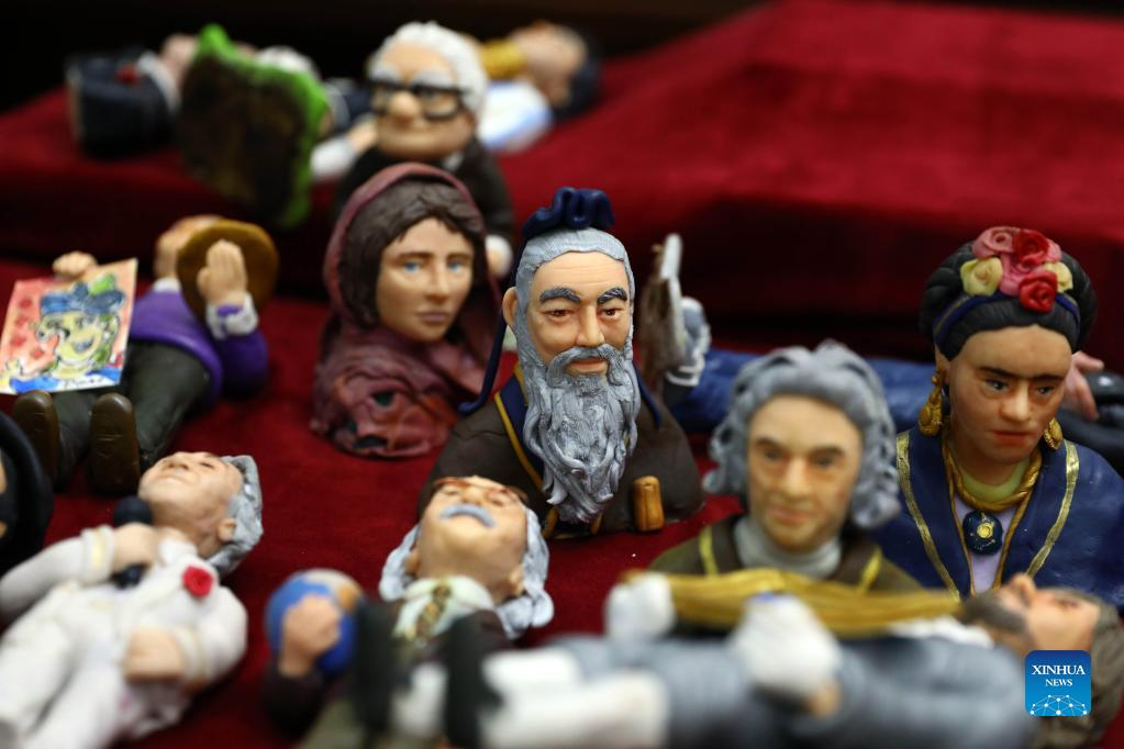 Photo taken on Jan. 2, 2022 shows miniature sculptures carved by Egyptian artist Fady Francis at his workshop in Cairo, Egypt. On a table in downtown Cairo, Fady Francis, 30, aligns miniature sculptures of 100 influential world figures, standing side by side in harmony, although the figures were from different cultures, spoke different languages and lived in different eras in history. (Xinhua/Ahmed Gomaa)