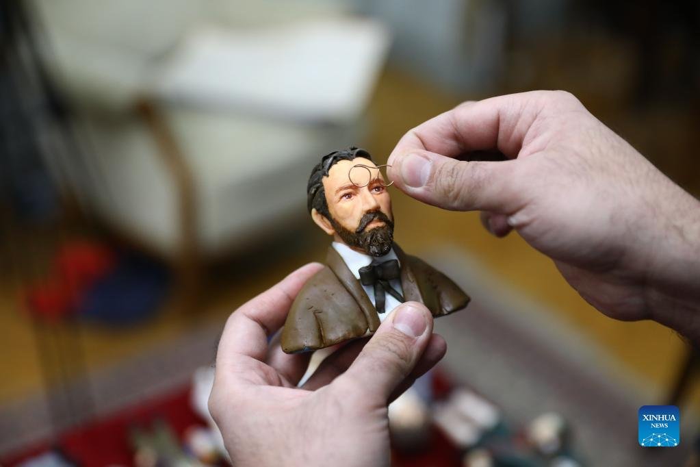 Egyptian artist Fady Francis holds his handmade miniature bust of Russian writer Anton Chekhov at his workshop in Cairo, Egypt, on Jan. 2, 2022. On a table in downtown Cairo, Fady Francis, 30, aligns miniature sculptures of 100 influential world figures, standing side by side in harmony, although the figures were from different cultures, spoke different languages and lived in different eras in history. (Xinhua/Ahmed Gomaa)