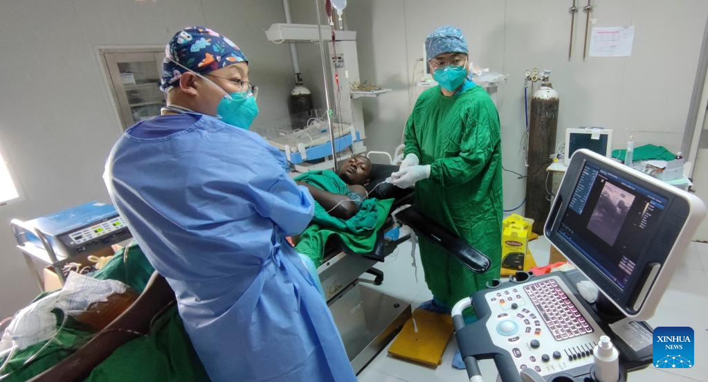 Chinese doctors check a patient's condition after surgery at a hospital in Kigali, the Rwandan capital, on Jan. 27, 2022. (Photo by Huang Wanqing/Xinhua)