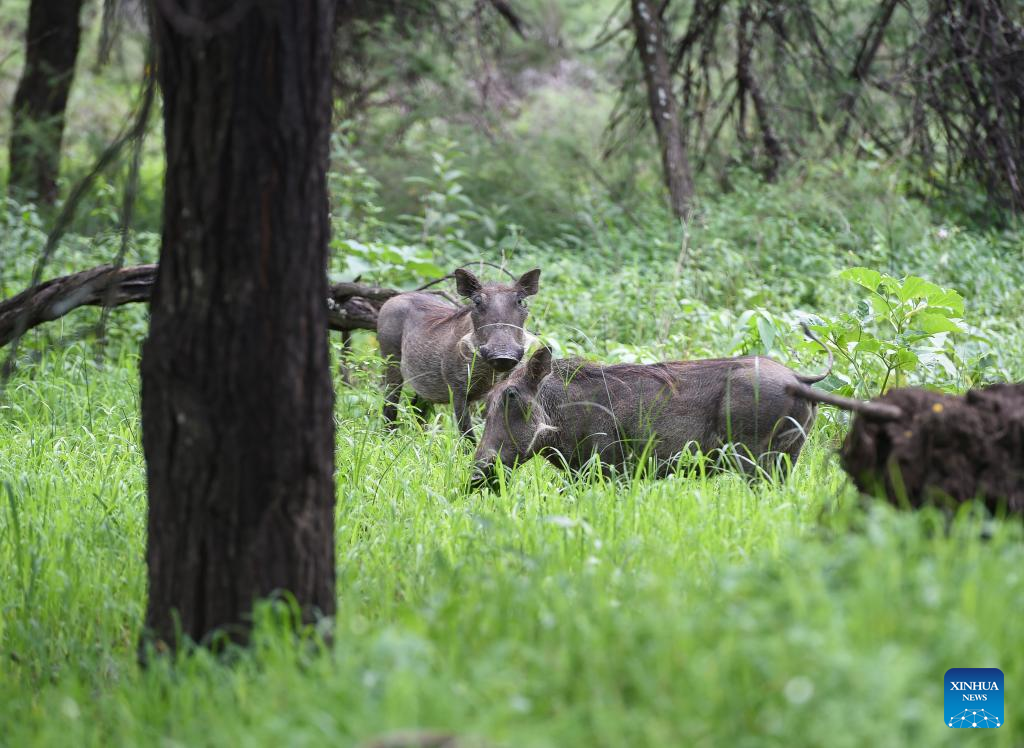Photo taken on Jan. 7, 2022 shows warthogs at the Gaborone Game Reserve in Gaborone, capital of Botswana.