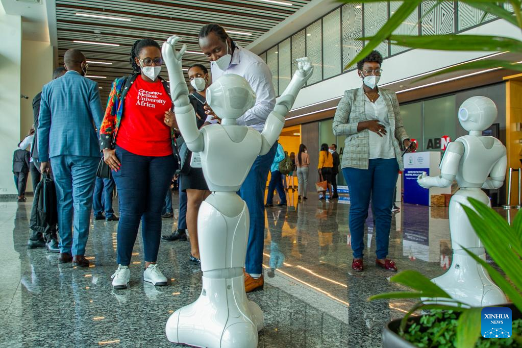 Robots are on display for the launch of the center for the fourth industrial revolution (C4IR) in Kigali, Rwanda, March 31, 2022. Rwanda on Thursday officially launched the center for the fourth industrial revolution (C4IR). (Photo by Cyril Ndegeya/Xinhua)