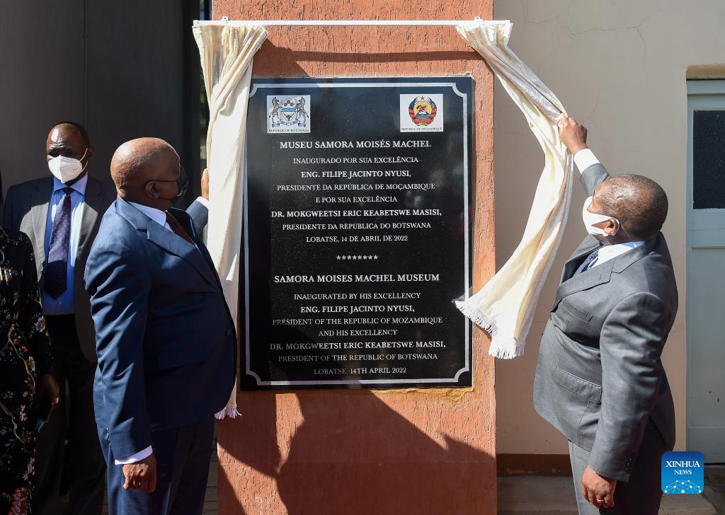 Botswanan President Mokgweetsi Masisi (L front) and Mozambique's President Filipe Jacinto Nyusi (R front) attend the commissioning of the Samora Machel Museum in Lobatse, some 70 km southeast of Gaborone, Botswana, on April 14, 2022. The governments of Botswana and Mozambique on Thursday commissioned the museum of the late revolutionary leader of the Mozambican liberation movement and Mozambique's first president Samora Moises Machel in Botswana. (Photo by Tshekiso Tebalo/Xinhua)