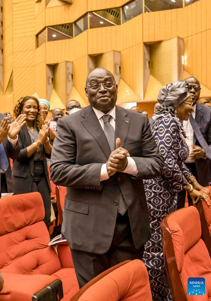 Tiemoko Meyliet Kone, vice president of the Republic of Cote d'Ivoire, attends a conference in Yamoussoukro, the de jure capital of Cote d'Ivoire, April 19, 2022. President Alassane Ouattara of Cote d'Ivoire on Tuesday appointed Tiemoko Meyliet Kone, the governor of the Central Bank of West African States (BCEAO), as the vice president of the Republic of Cote d'Ivoire. (Photo by Yvan Sonh/Xinhua)