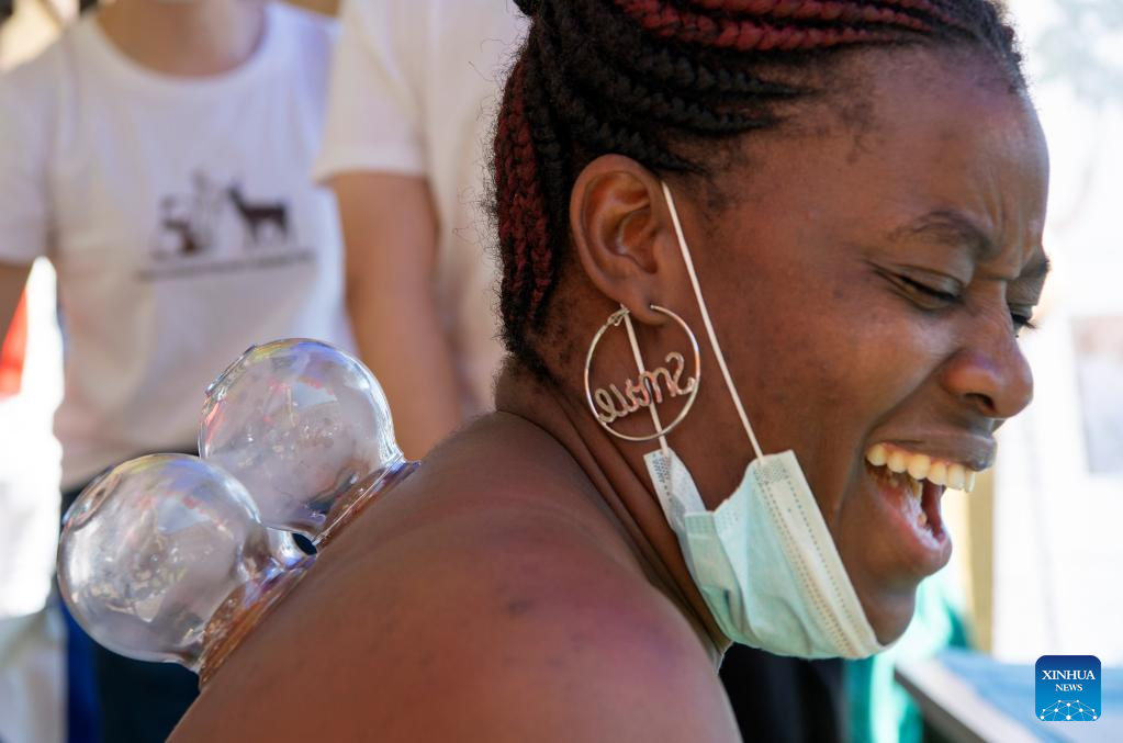 A woman experiences a treatment of traditional Chinese medicine at an event celebrating the UN Chinese Language Day in Windhoek, Namibia, on April 22, 2022. Chinese culture and language are contributing to global cultural diversity, said Pro-Vice-Chancellor Ellen Namhila of the University of Namibia (UNAM) Friday as the institution celebrated the Chinese Language Day in Windhoek, the Namibian capital. (Photo by Musa C Kaseke/Xinhua)