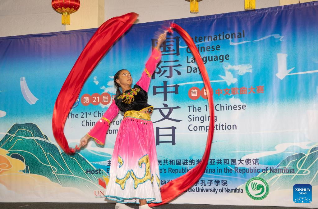 A student performs traditional Chinese dance during an event celebrating the UN Chinese Language Day in Windhoek, Namibia, on April 22, 2022. Chinese culture and language are contributing to global cultural diversity, said Pro-Vice-Chancellor Ellen Namhila of the University of Namibia (UNAM) Friday as the institution celebrated the Chinese Language Day in Windhoek, the Namibian capital. (Photo by Musa C Kaseke/Xinhua)