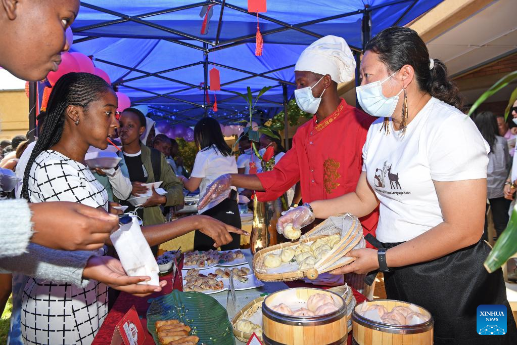 People try traditional Chinese food at an event celebrating the UN Chinese Language Day in Windhoek, Namibia, on April 22, 2022. Chinese culture and language are contributing to global cultural diversity, said Pro-Vice-Chancellor Ellen Namhila of the University of Namibia (UNAM) Friday as the institution celebrated the Chinese Language Day in Windhoek, the Namibian capital. (Photo by Musa C Kaseke/Xinhua)