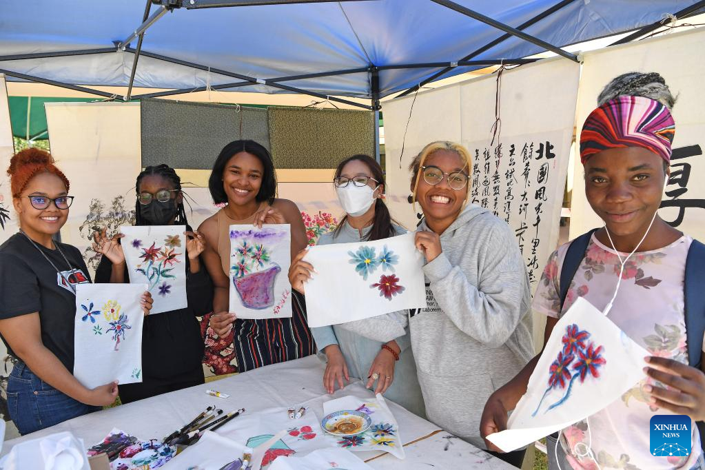 Students show their traditional Chinese paintings during an event celebrating the UN Chinese Language Day in Windhoek, Namibia, on April 22, 2022. Chinese culture and language are contributing to global cultural diversity, said Pro-Vice-Chancellor Ellen Namhila of the University of Namibia (UNAM) Friday as the institution celebrated the Chinese Language Day in Windhoek, the Namibian capital. (Photo by Musa C Kaseke/Xinhua)