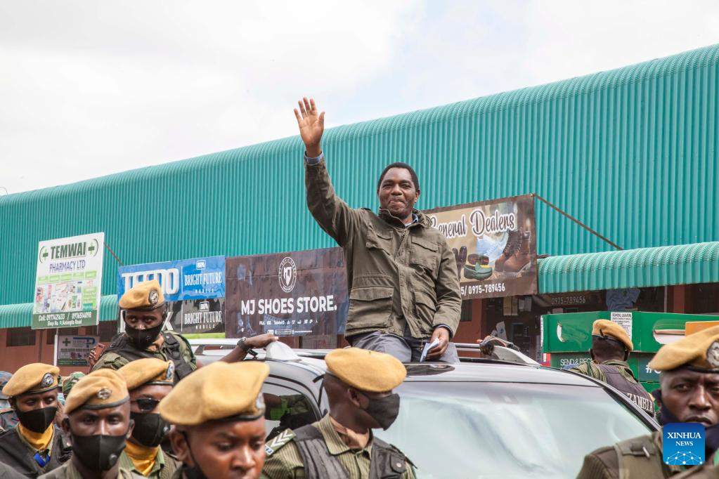 Zambian President Hakainde Hichilema waves during the Kaunda Day celebration in Lusaka, Zambia, on April 28, 2022. Zambians on Thursday marked the inaugural Kaunda Day in honor of the country's founding leader Kenneth Kaunda with a call to promote the value of unity that he espoused. (Photo by Martin Mbangweta/Xinhua)