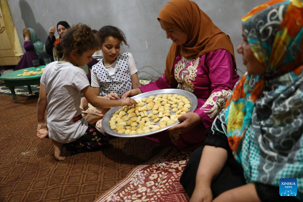 An Egyptian family have homemade traditional biscuits for Eid al-Fitr at their house in Monufia Governorate, Egypt, on May 1, 2022. (Xinhua/Ahmed Gomaa)