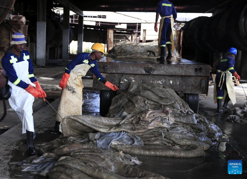 Workers process cow hides at a tannery in Bulawayo, Zimbabwe, on May 3, 2022. (Photo by Shaun Jusa/Xinhua)