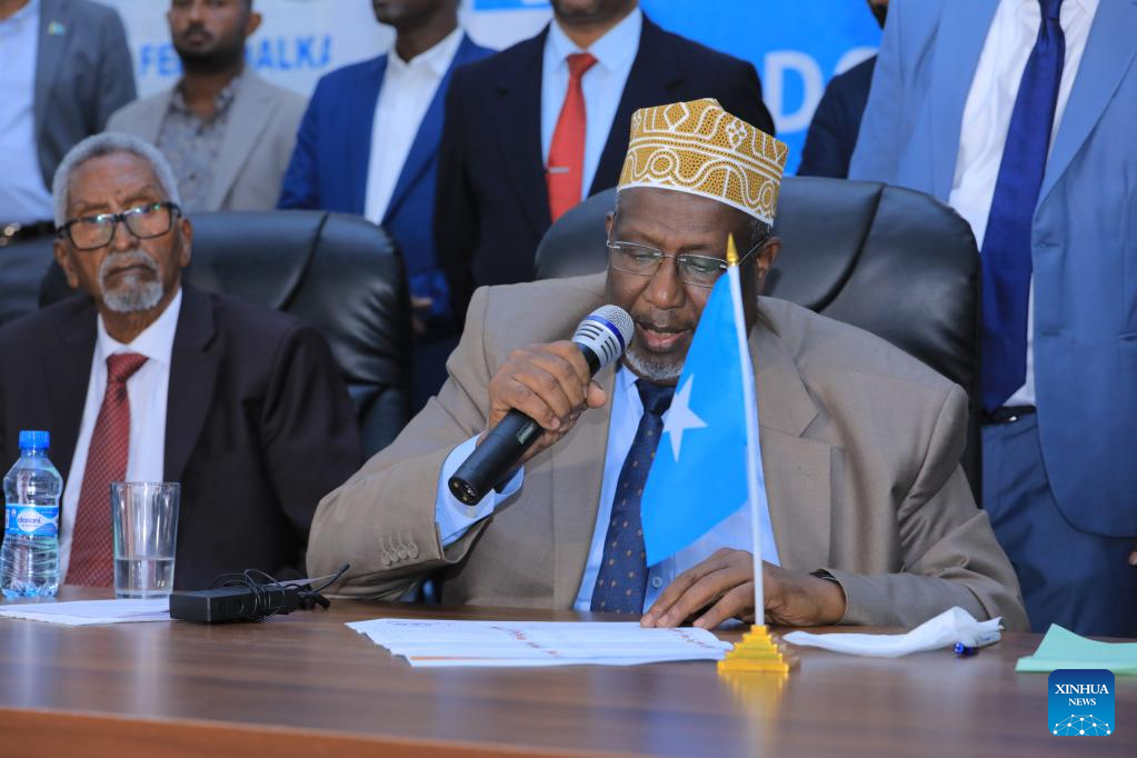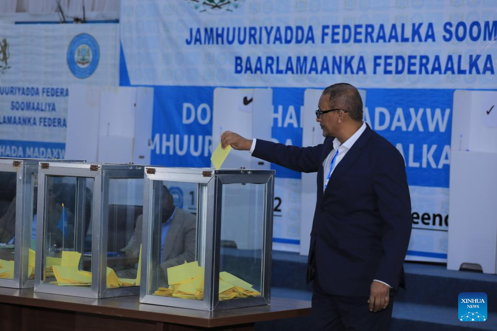 The 67-year-old Mohamud, former Somalian president in 2012-2017, won 214 votes from lawmakers, defeating incumbent President Mohamed Farmajo, who garnered 110 votes. Mohamud was immediately sworn in after the vote. (Photo by Hassan Bashi/Xinhua)