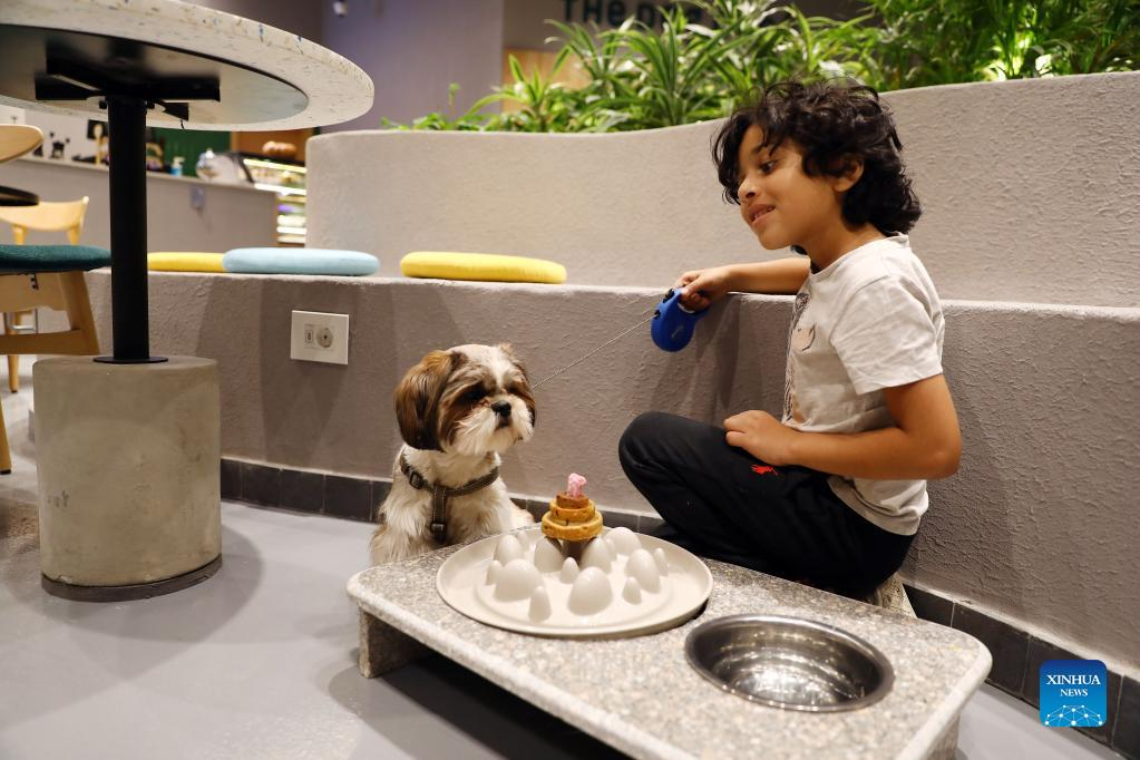 A child spends time with his dog at a dog cafe in Giza, Egypt, on May 15, 2022. (Xinhua/Ahmed Gomaa)